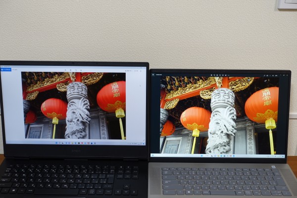 色域が狭いパネルを搭載したノートPCを並べてみました(右が色域が狭いパネル搭載モデル。左がレビュー機)。色域が狭いパネルは、暖色系が黄色っぽく描写されますが、レビュー機はより忠実に色が再現されているのがわかります。