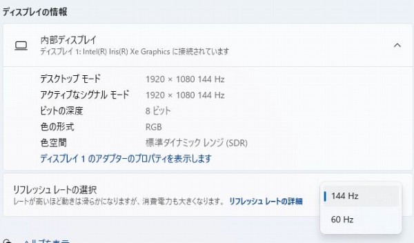OMEN 16-k(インテル)に搭載されるパネルの最大リフレッシュレートは144Hz or 165Hz(パネルにより異なります)。レビュー機は144Hzパネルを搭載。一般的なモニタのリフレッシュレートが60Hzですから、より滑らかな表現が可能になります。「設定」画面の「ディスプレイの詳細設定」でリフレッシュレートの切り替えが可能です。