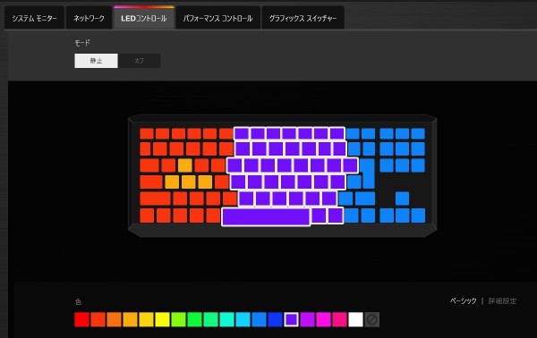 OMEN Gaming Hubツールの「LEDコントロール」でカスタマイズすることが可能。このツールでは、4つのゾーンで色を設定できます。モードは静止/オフの2つだけです。