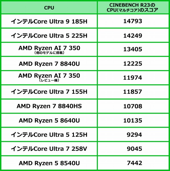 CPUの性能を測定するCINEBENCH R23のスコアは11974。 同じAMD Ryzen AI 7 350プロセッサを搭載している他のモデルのスコアが13405なので、それを下回っています。