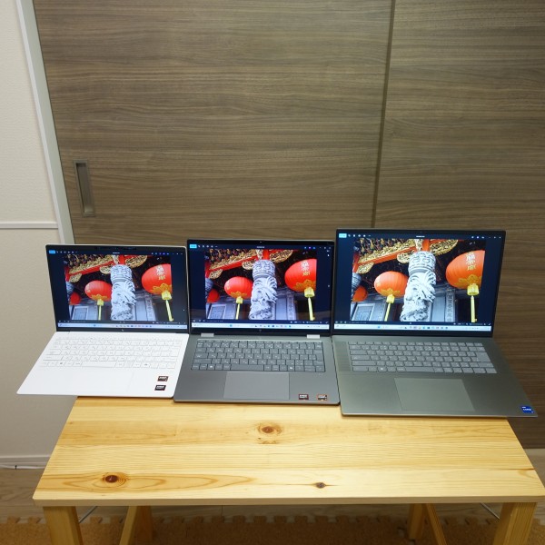 13.3インチ/16インチPCを並べてみました(左:13.3インチノート/真ん中:レビュー機(14インチ)/右:16インチノート)。
