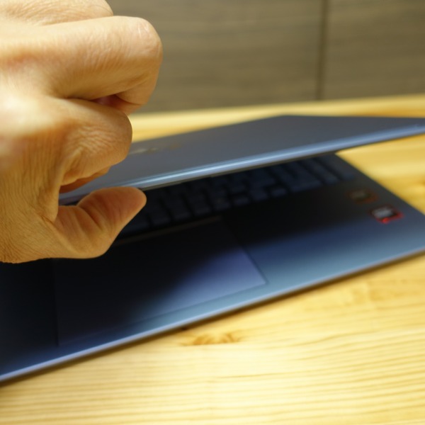 16インチPCとしてはそんなに重くは感じないですね。これぐらいの重さなら、室内を移動するなど、ちょっとの距離を移動する際には苦にならないかも。ボディのつくりが結構しっかりしているので、片手だけで持ってもボディのたわみ等はほとんど感じませんでした。
