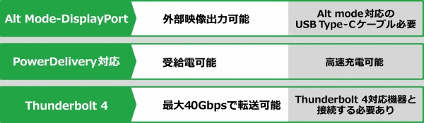 USB Type-C端子は2つとも、DisplayPort/PowerDeliveryに対応していますが、Thunderboltには非対応です。
