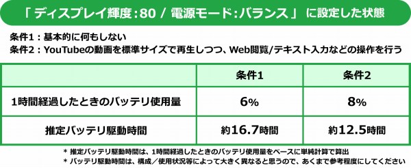 バッテリ駆動時間を実際に計測してみました。 条件1の何もしない状態で約16.7時間、条件2の動画再生した状態で約12.5時間バッテリが駆動する計算です。