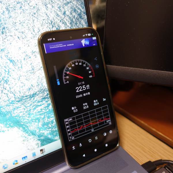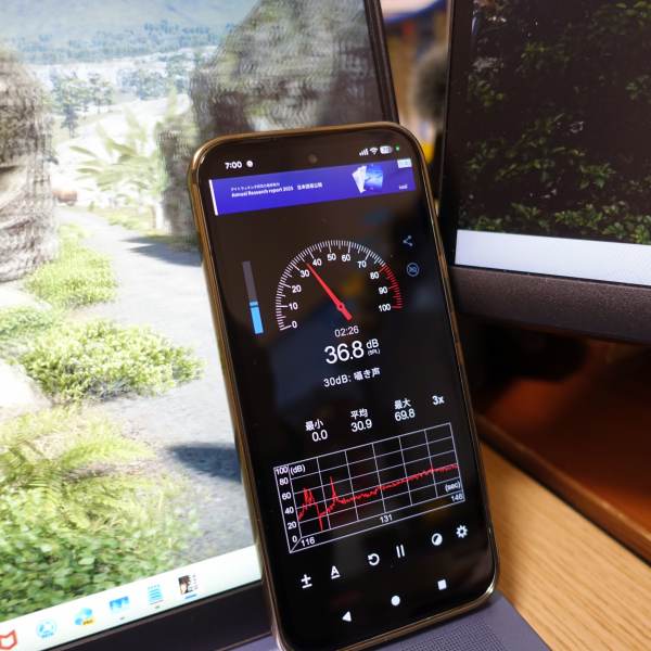 ファンの音をスマホの騒音計アプリで計測してみました。ネットを見るなど一般的な使い方をしているとき、僕が使用した限りでは、ファンの音がほとんど聞こえてこず、20-30dB程度で静かです。