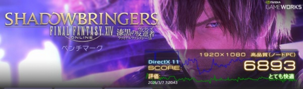 負荷が中程度のベンチマーク「ファイナルファンタジー14漆黒の反逆者」の結果は、高品質/最高品質ともに「とても快適」。