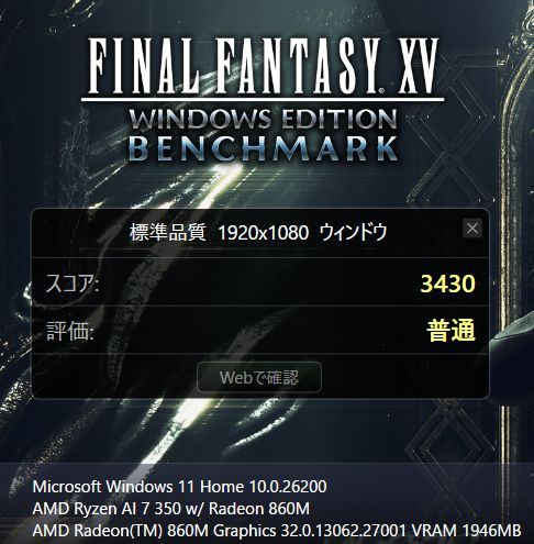 重い負荷のかかるFF15ベンチマークの結果は 「軽量品質」で「やや快適」、「標準品質」で「普通」、「高品質」で「やや重い」。