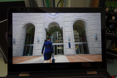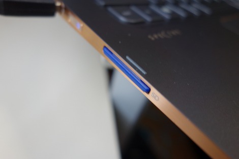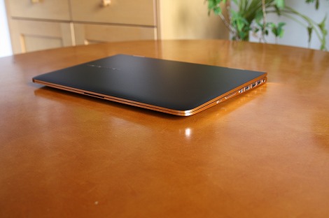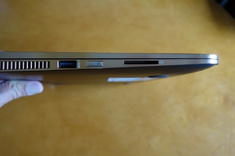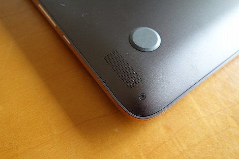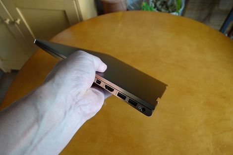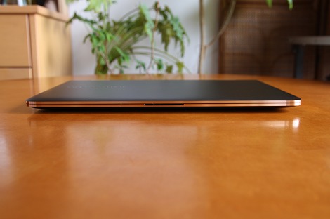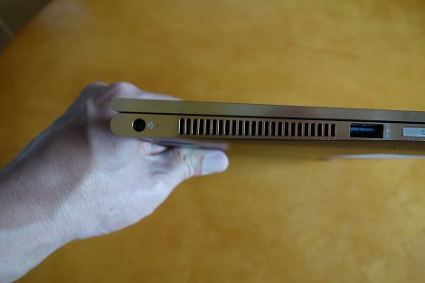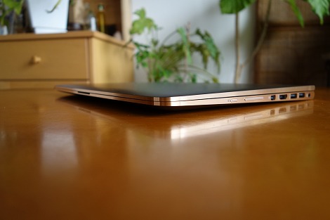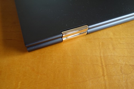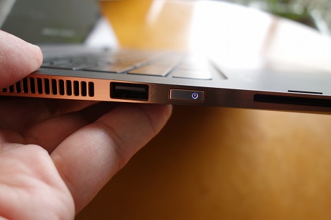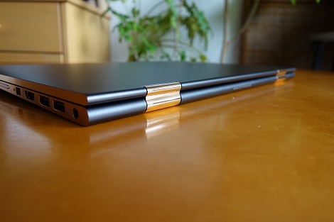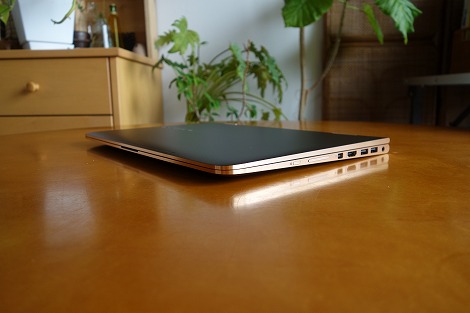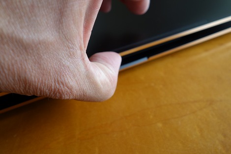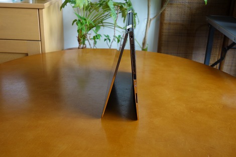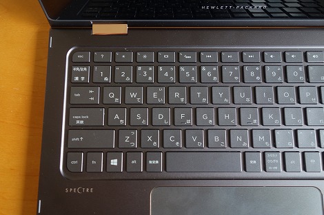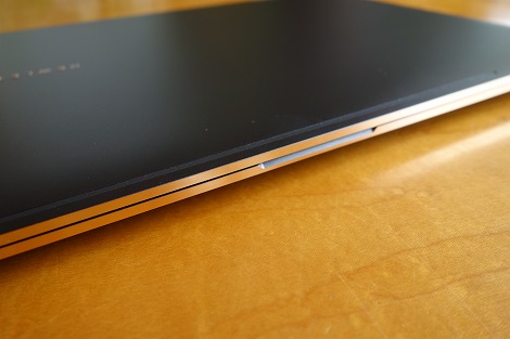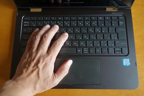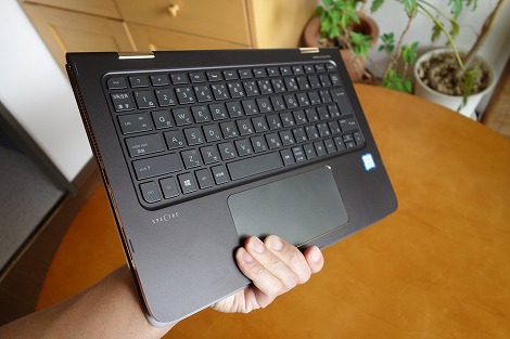 通常のノートだと液晶を開くのに両手を使う必要があるのですが、Spectre 13は片手だけで液晶をひらけるので、すごく便利です。