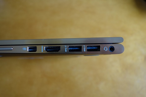 Mini DisplayPort、HDMI、USB3.0×2(電源オフUSBチャージ機能対応)、ヘッドホン/マイクコンボポートが配置されています。