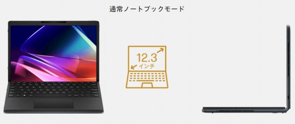一般的なノートPCのように使えます。この場合のパネルサイズは12.3インチ。ちょっと小さめかな。