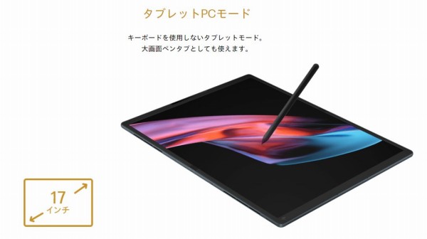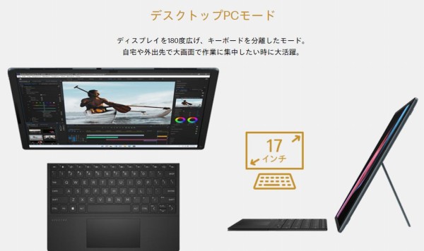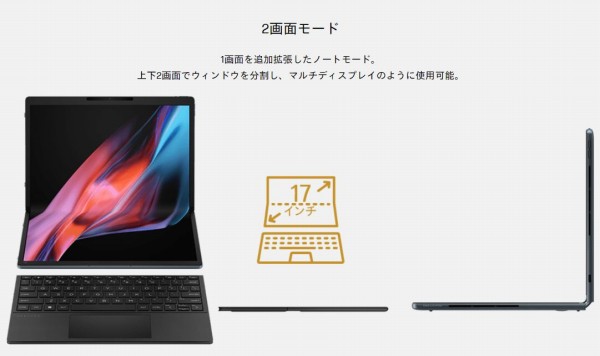 | ディスプレイ | 最大17インチ・2.5K ブライトビュー(光沢)・OLED Foldableタッチディスプレイ (2560×1920 / 4:3 / 400nit) テュフ・ラインランドEyesafe認定ディスプレイ |