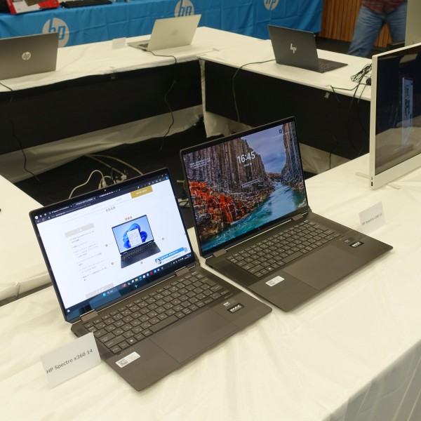 同時に発表された16インチノートSpectre x360 16-aaがイベントに展示されていたので並べてみました。上の画像の左がSpectre x360 14-euです。こうして見るとパネルの大きさの違いがよくわかりますね。Spectre x360 14-euの方がすごくコンパクトです。