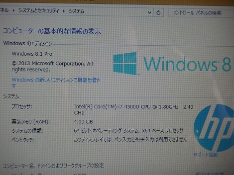 このPavilion 15-n200には、インテル第4世代Core i7プロセッサを搭載。メモリは4GBです。