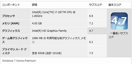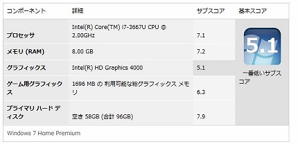■ENVY14-3100のWindowsエクスペリエンスインデックスの値