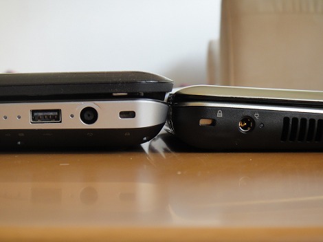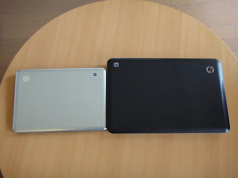 同じHPの15インチ液晶ノートPavilion dv6と比べてみました(dv6のレビューはこちら)。左がdm1aですが、一回り小さいのがわかります。