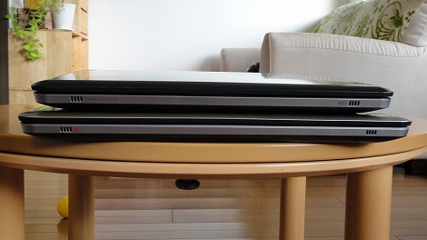 15インチ液晶のHP Pavilion dv6(dv6のレビューはこちら)と薄さを比較してみました。上がdv6、下がdv7です。厚さがほとんど同じなのがわかります。