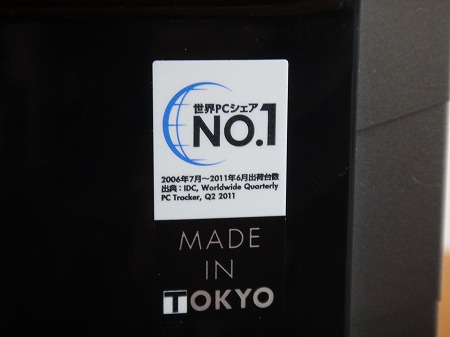 前面部の中央右には世界PCシェアNo1であることを示すシールが貼り付けられています。さらに、その下には東京の昭島工場で生産されたことを示すシールが貼り付けられています。